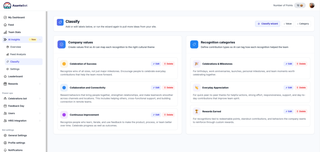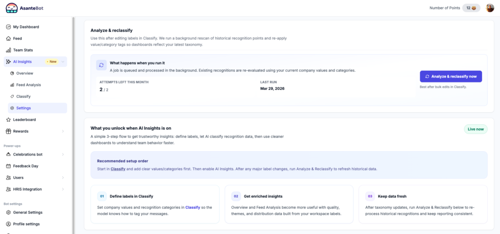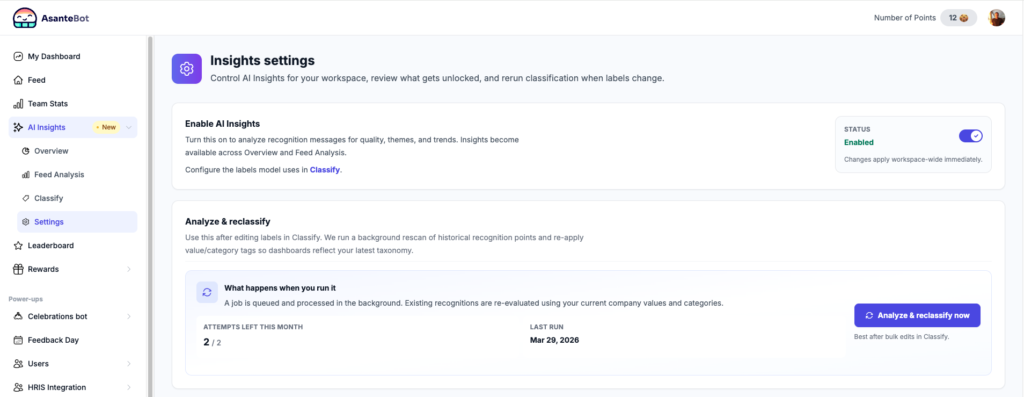 AI Insights is a built-in analytics layer inside AsanteBot that automatically classifies every recognition message in your Slack workspace against two things: