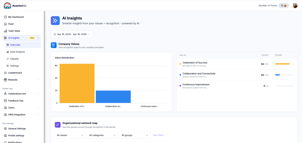 - An Overview dashboard showing value distribution, an organizational network map, and recognition category breakdown.