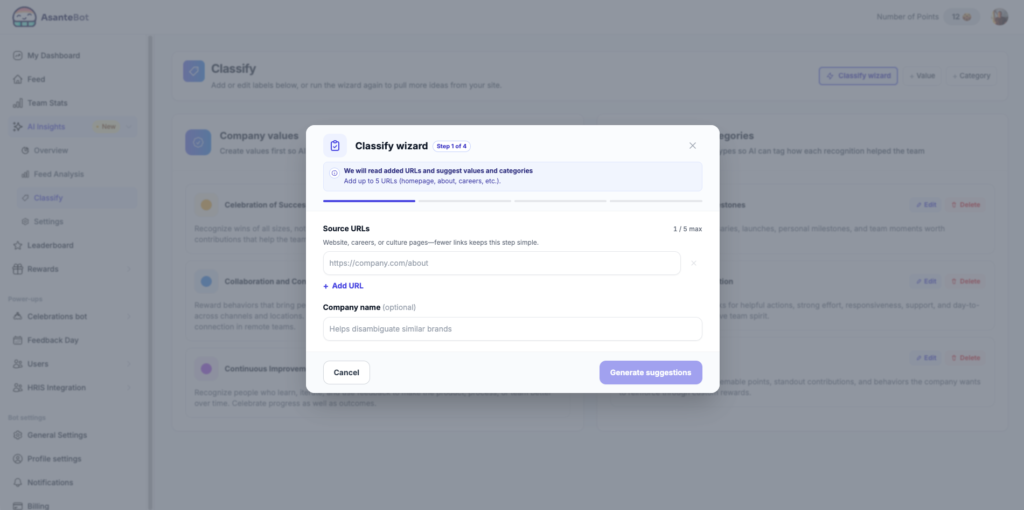 Click Generate suggestions and the AI will read your pages and propose a starting set of company values and recognition categories tailored to your organization.