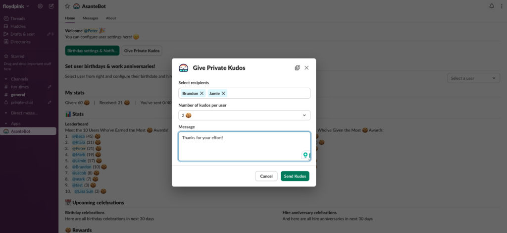 Sending Private Kudos is quick and natural inside Slack with Asante Bot.